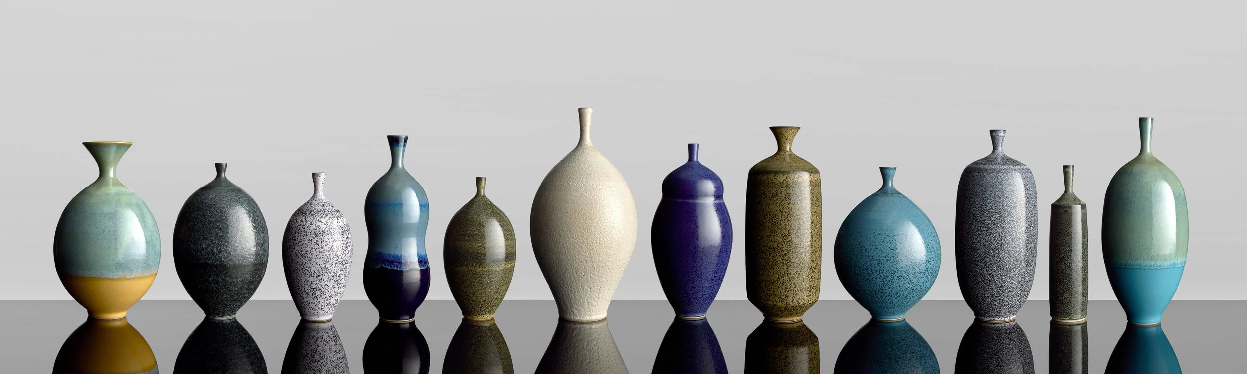 Each vessel features a narrow opening, elongated profile, and carefully balanced composition. Though abstract, they retain a sense of familiarity — inviting engagement through repetition and variation. Their energy builds as a group, creating a sense of movement and continuity through space.